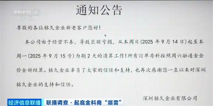 记者了解到,目前已有多家黄金原料供应商在网上发公告,称公司由于经营不善,导致巨额亏损,正在进行清算工作,所有订单存料按照9月13日融通金金价全部结算。随后记者也来到一家发布公告的黄金原料供应商了解情况,该负责人表示,公司资金链确实已经断裂,无法履行与下游商家的合同,目前已经在变卖个人资产去还债。