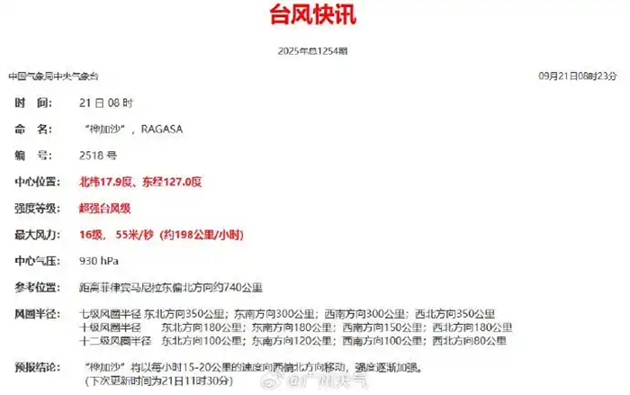 “桦加沙”强度为16级(55米/秒),成为今年以来西北太平洋最强台风。预计,“桦加沙”将以每小时15公里的速度继续向西北方向移动,强度还将继续增强。22日“桦加沙”将穿过巴士海峡,23日凌晨进入南海东北部海面,以后趋向广东沿海。