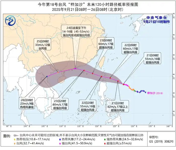从中央气象台9月21日10时发布的预报图看,“桦加沙”进入南海前,中心附近最大风力可加强至17级以上,进入南海时中心附近最大风力仍将达到17级,在24日凌晨至下午接近或登陆广东沿海地区时,中心附近最大风力仍可达到14级至16级的强台风级或超强台风级。