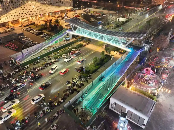 不同于传统过街天桥的单一功能,印象济南天桥在设计上充分考虑了实用性与美观性的统一。桥梁整体呈“C”字形布局,桥下净空5米,既保障了车辆通行高度,又通过流畅的曲线造型融入周边商业环境,视觉通透、不遮挡视线。同时项目结合全龄友好理念,进行无障碍设计,配备两部直梯及1:4 梯道、推行坡道,保障市民安全高效通行。