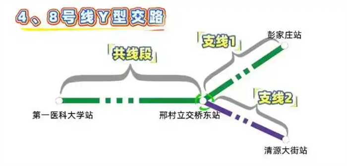 如果需要从彭家庄站去往8号线清源大街方向(或反向,从清源大街往4号线彭家庄站方向),则需要在邢村立交桥东站下车,换到另一个站台乘车,也就是从 Y 型交路 “小脚丫” 的一侧换乘到另一侧。