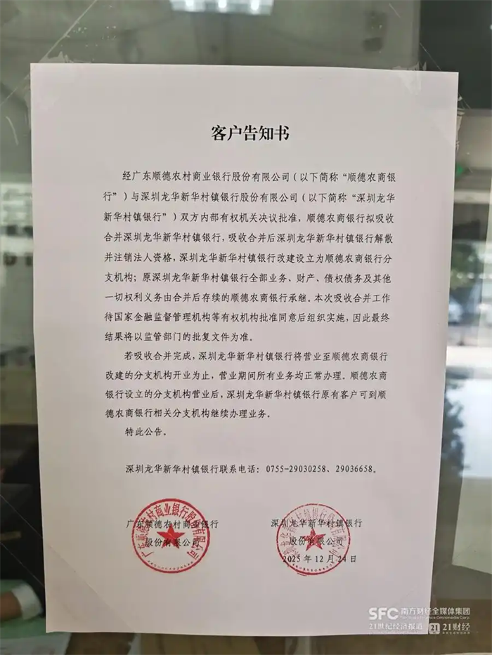 记者也注意到该行门口张贴的《客户告知书》,其中提到:“若吸收合并完成,深圳龙华新华村镇银行将营业至顺德农商银行改建的分支机构开业为止,营业期间所有业务均正常办理。顺德农商银行设立的分支机构营业后,深圳龙华新华村镇银行原有客户可到顺德农商银行相关分支机构继续办理业务。”