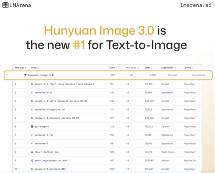 10月5日,国际权威AI大模型评测平台LMArena最新榜单显示,腾讯混元图像3.0在全球26个主流文生图大模型中排名第一,超越包括nano-banana在内的多个顶尖闭源模型,引发业界广泛关注。