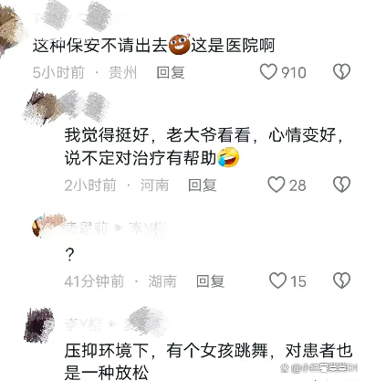 有网友说这种保安都不请出去,这可是医院啊,这时有人说我觉得挺好,老大爷看看心情变好,说不定对治疗有帮助。