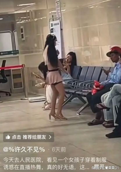这不,近日在广东一家医院,有个漂亮女孩在大庭广众之下穿着暴露,当众扭腰热舞,引来一大群病患围观,看到这一幕,网上的人不禁直言“在医院这样不大合适吧,这是个严肃的地方。”