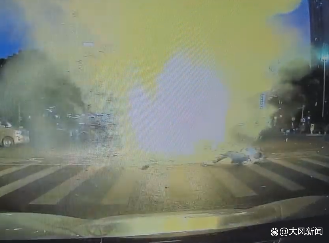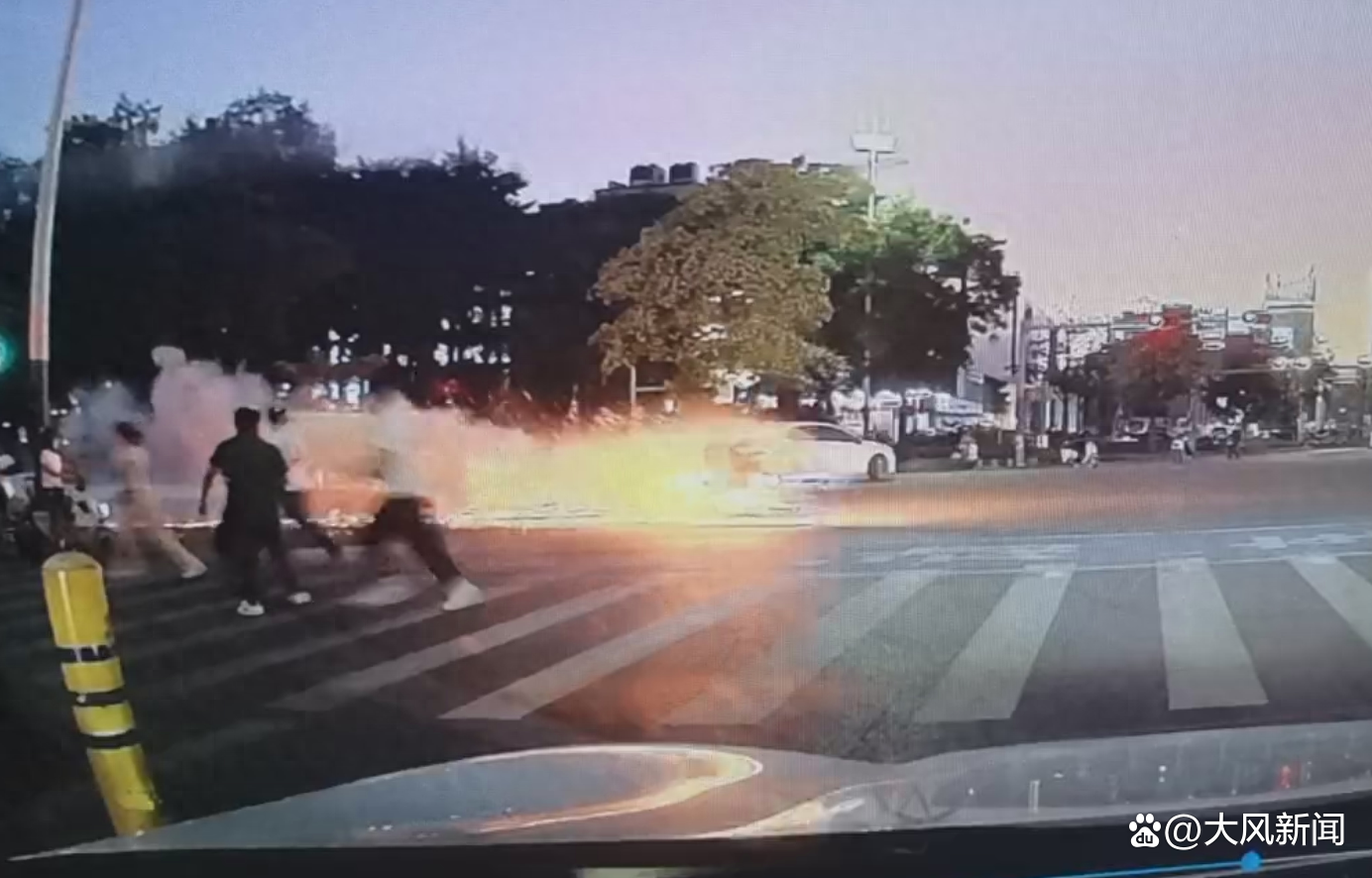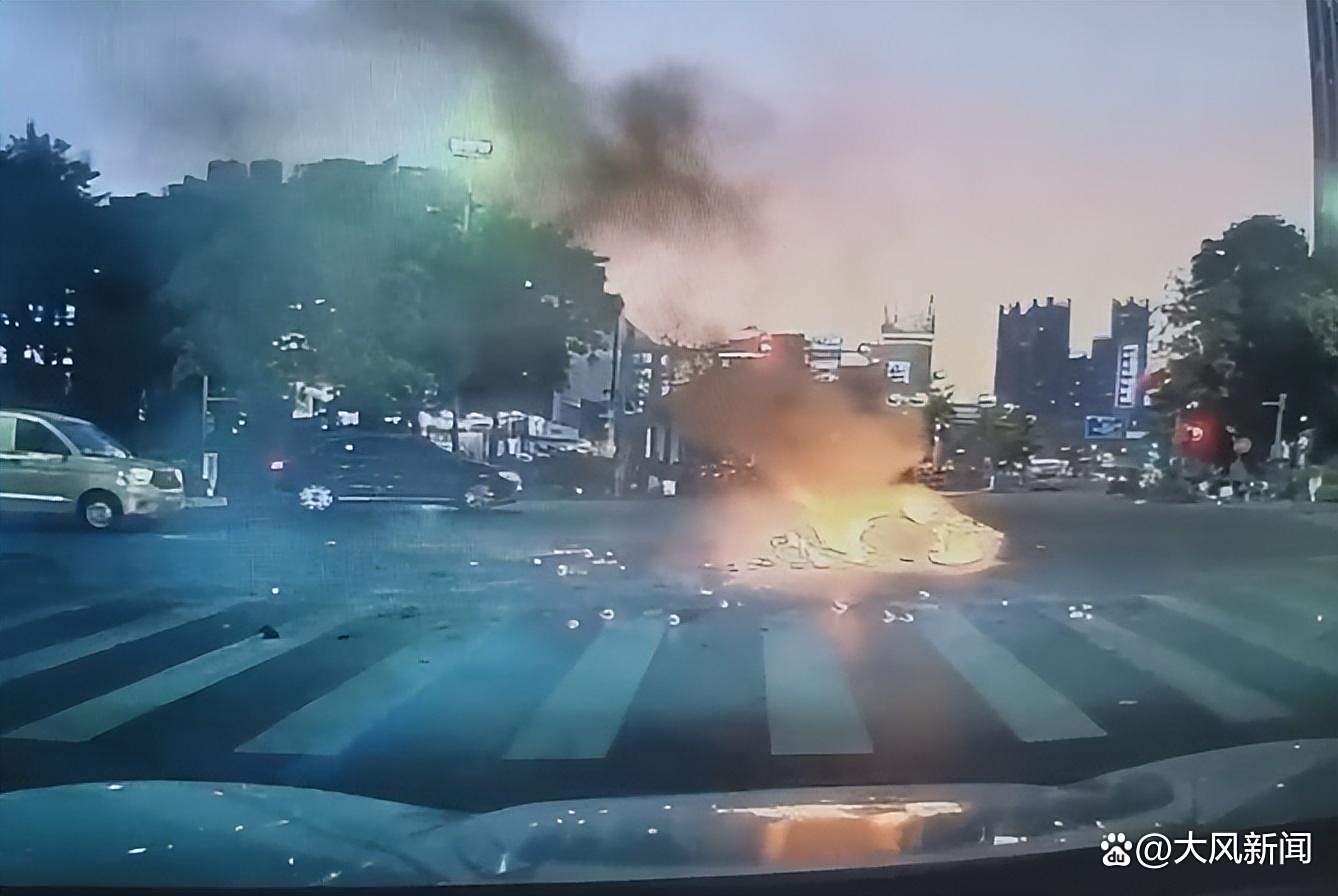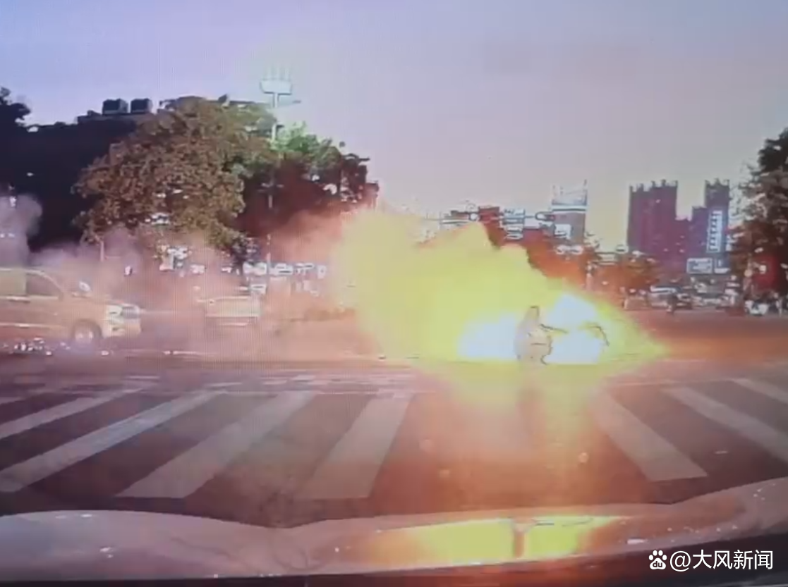 网友发布的视频显示,一市民骑电动自行车经过交叉路口时,车身出现自燃,火星四溅,随即车辆失控倒地,电动车进一步燃烧。火光中,市民躺地翻滚逃生。