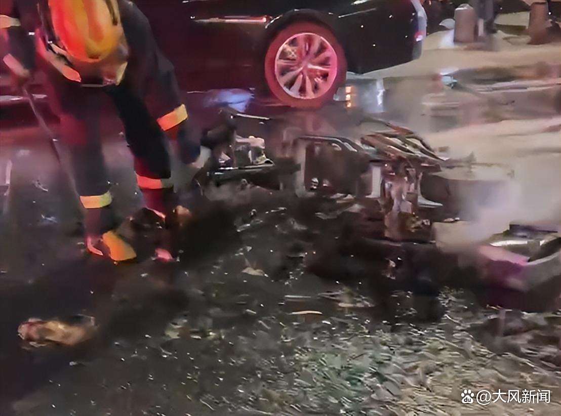 另一段视频显示,疑似电动车车主的男子在事故现场附近,衣物被烧损严重。随后,现场有消防队员到场灭火。画面中,自燃的电动车已经仅剩下框架。