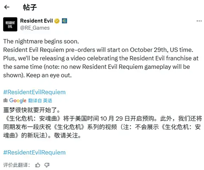 今日,卡普空官方在社交平台X正式宣布,《生化危机9:安魂曲》预购将于北京时间10月30日开启,同时官方将发布一段致敬《生化危机》系列的视频(注:不含《安魂曲》新游戏画面)。敬请关注。
