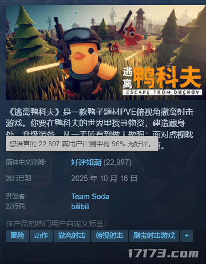10月16日,由B站自研的搜打撤单机PVE游戏《逃离鸭科夫》正式上线,目前游戏Steam国区好评96%。