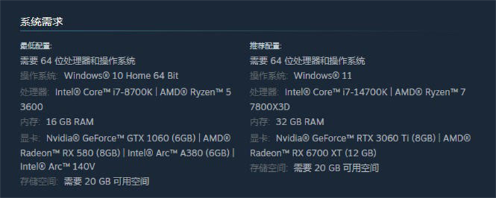 官方系统要求显示,游戏最低需要Windows 10系统、Intel Core i7-8700K或AMD Ryzen 5 3600处理器、16 GB内存以及GTX 1060或RX 580显卡。为获得最佳体验,推荐使用Windows 11系统搭配i7-14700K或Ryzen 7 7800X3D处理器、32 GB内存及RTX 3060 Ti或RX 6700 XT显卡。