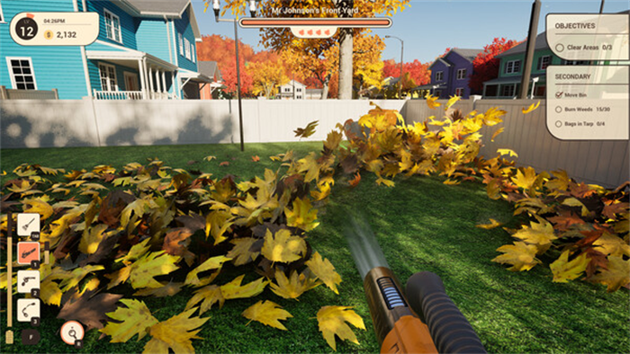 游戏提供了丰富多样的内容,包含超过20个独特关卡和场景。从阳光明媚的学校操场到大雨倾盆的网球场,从突降暴雪的户外场地到镇长日落后要求紧急打扫的花园,每个场景都带来不同的挑战。玩家需要根据环境条件选择合适的工具和策略,展现专业的吹叶技艺。