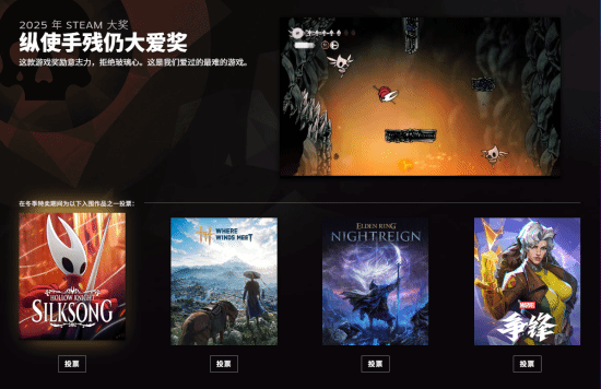 近日,《燕云十六声》官推发布动态,很荣幸能获得Steam大奖“纵使手残仍大爱奖”的提名!这是对坚持不懈、不断成长以及一起走过这条道路的探索者的致敬。官方还放出个投票链接,希望能多多获得玩家们的支持。