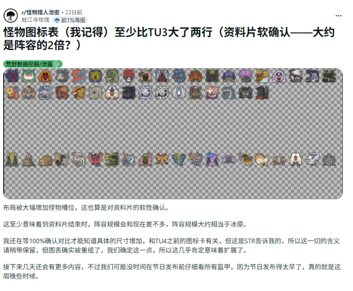 RoseKaedae表示,这次在图标布局上进行调整,以便增加更多怪物栏位,可以算作对DLC的一种非官方确认。这至少意味着,到DLC结束时,怪物数量可能会扩充到和现在一样的规模,相当于《怪物猎人:冰原》的数量大小。